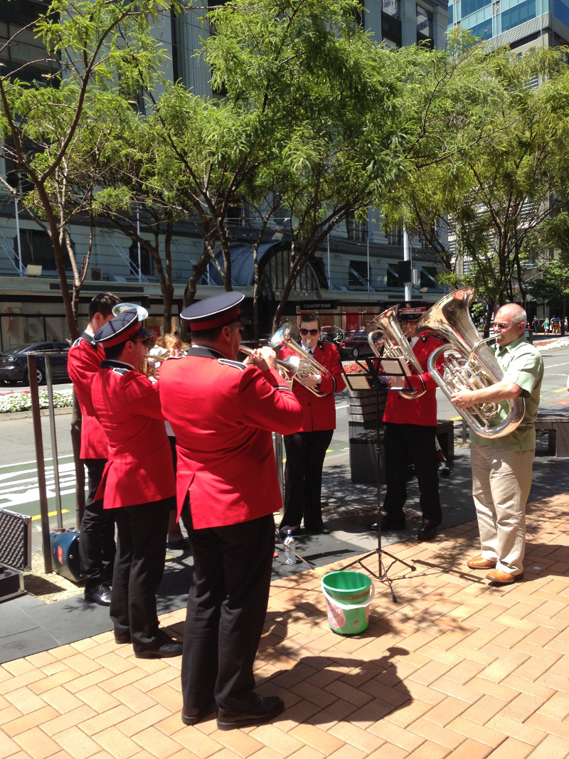 Eine Kapelle der „The Salvation Army“ (Jack White „Seven Nation Army“)spielt muntere Swingvariationen von „Rudolph The Red Nosed Reindeer“ und wir warfen auch ein paar Coins in den Spendeneimer. Gegen Mittag trafen wir uns mit Konstanze und ihren beiden bezaubernden Töchtern. Sie hatten, durch Straßenmusik (Geige+Cello) in einer Stunde rund 60 NZ$ zu Gunsten einer Zirkusschule eingenommen. Konstanze hat vor sieben Jahren (mit ihrem NZ Mann) Deutschland den Rücken gekehrt und ist seither hier ansässig. Es war für uns hoch interessant (ohne die Sprachbarriere) ein wenig Internes über das Leben hier unten (ich sammele da noch und werde zu späterer Gelegenheit was dazu schreiben) zu erfahren.