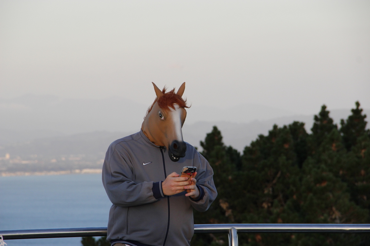 Neben dem tollen Blick auf die Bucht, konnte man diversen Leuten bei der Herstellung von „Pix and Vids for Mom“ zusehen. Neben den üblichen Zetteln vor der Brust, gab es einen jungen Mann, der für „Private Movie“ mit einer Pferdemaske posierte.
