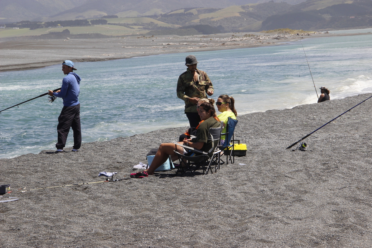 In Lake Ferry gibt es eine große aus anthrazitfarbenen Schotter bestehende Düne (irgendwie auch einmalig in der Welt, auf der dutzende Kiwis Angeln. Hier werden 60 cm große Fische zu Ködern zerschnitten, wie groß soll da der eigentliche Fang sein?