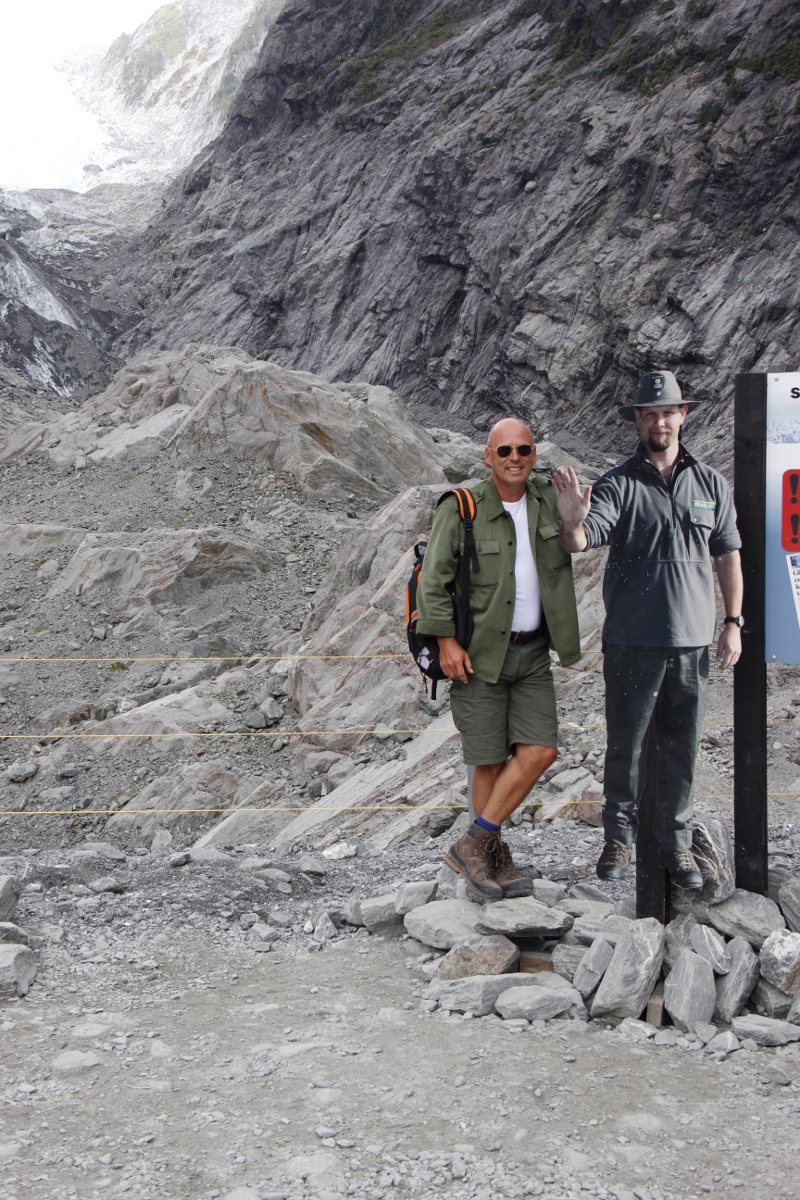 Der allgegenwärtige Ranger Bob gibt auf Hinweistafeln Ratschläge zum Daypack und zur Annäherung im Gelände. Das Ganze erweist sich dann als ein 8m breiter, geschotterter Weg, auf dem die gesamte Prozession von statten geht. An der Gletscherzunge drängen sich begeistert Asiaten und Amerikaner. Sie schauen sich die beständig schrumpfende Gletscherzunge, das Ergebnis ihrer Konsum- und Klimapolitik, an. Während dessen fliegen ununterbrochen Hubschrauber mit Scenic-Flights (5 Minuten 99 NZ$ pro Nase) über unsere Köpfe.