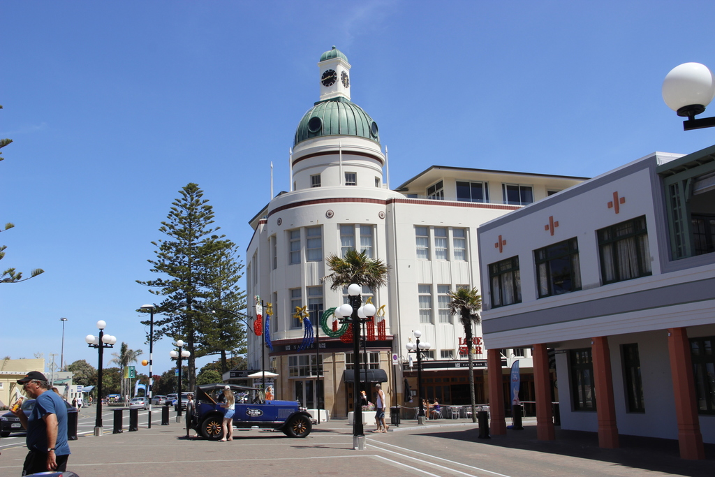 Auf unserem Weg zum Lake Taupo haben wir am 2.1. Napier einen Besuch abgestattet. Die Stadt wurde am 3. Februar 1931 durch ein gewaltiges Erdbeben (7,8) und die anschließenden Feuer komplett zerstört. Die (Innen)Stadt wurde anschließend im Art Deco Stil geplant und wieder aufgebaut. Die wunderbaren Pastellfarben entstanden aus der Not heraus. Farben waren teuer, wurden also verdünnt. Die Stadt war (bedingt durch den Feiertag) noch ein bisschen ausgestorben, wir konnten (bei wunderbarem Sommerwetter) alles zu Fuß erkunden. Tolle Häuser, aber leider auch nicht Erdbeben sicher.