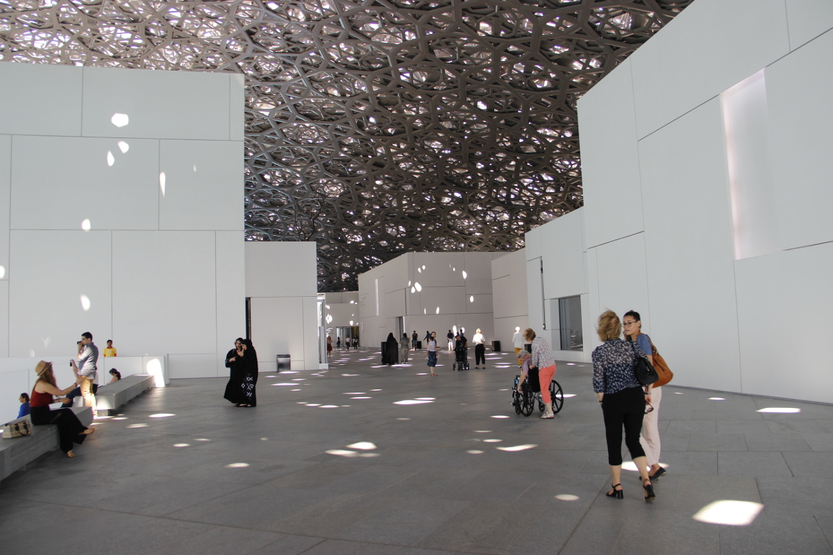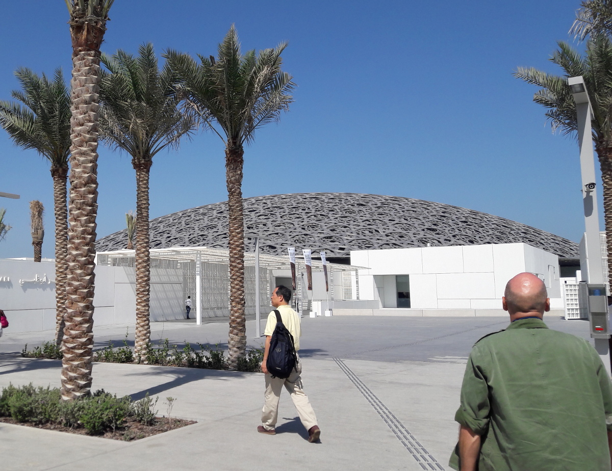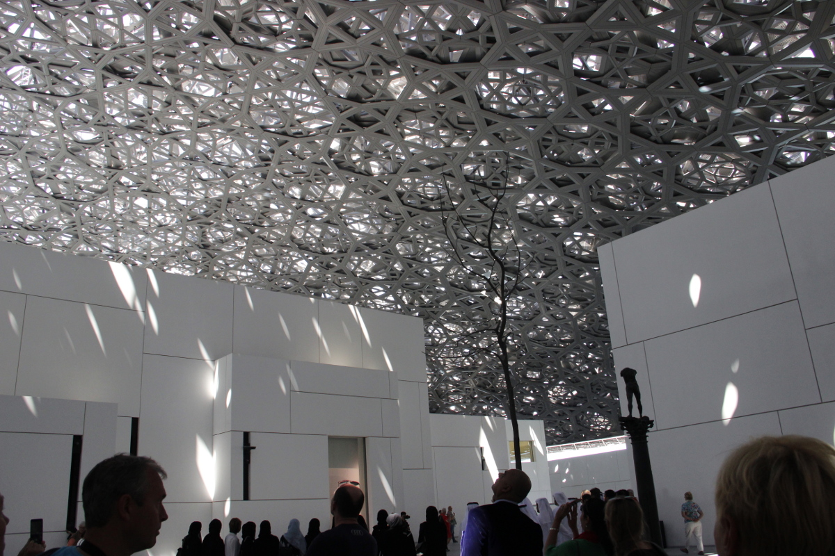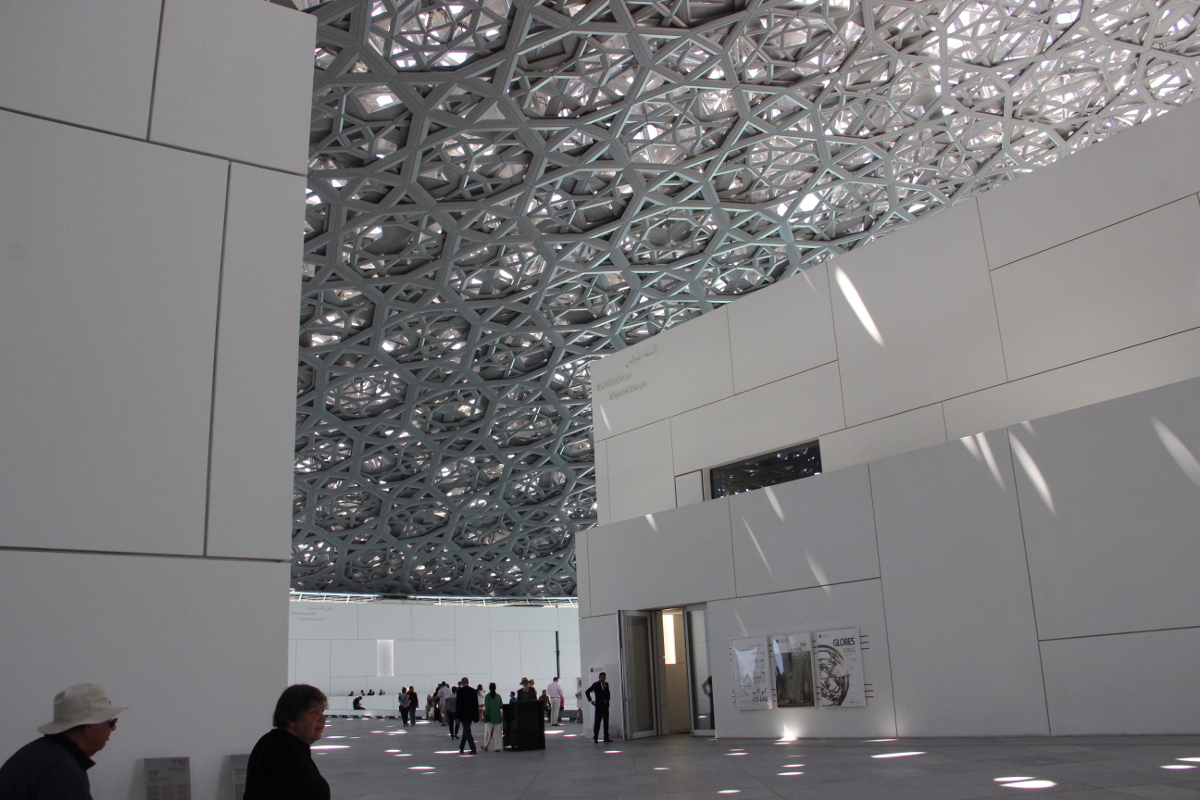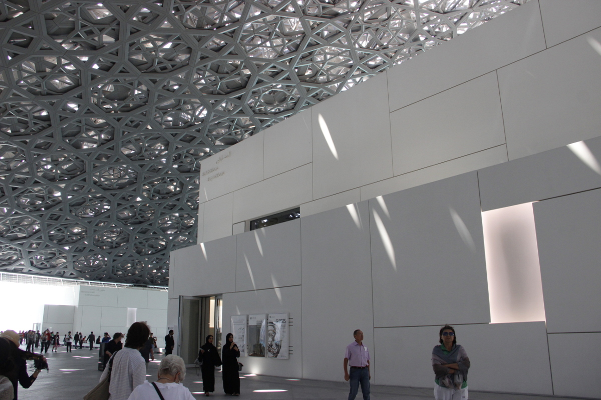Wir überqueren mit dem Taxi eine Brücke auf dem Weg zu einer der vielen künstlichen Inseln. Auf Saadiyat Island entsteht ein neues Kulturviertel. Neben dem Louvre wird hier das Guggenheim Abu Dhabi und ein Nationalmuseum entstehen. Was wir bei unserer Ankunft sehen, ist sicherlich nach Angkor ein Highlight dieser Reise. Das Museum ist architektonisch schlicht überwältigend. Konzipiert ist die Sammlung des Louvre auf die Zeit von der Antike bis zum 21. Jahrhundert. Die Ausstellungen sind sorgfältig kuratiert (die Scheichs sind wahrscheinlich mit einer sehr großen Brieftasche einkaufen gegangen) und mit modernster Technik präsentiert.