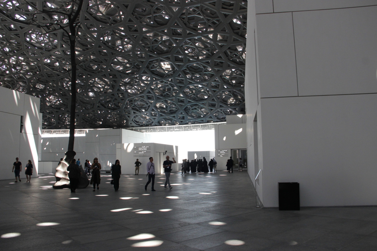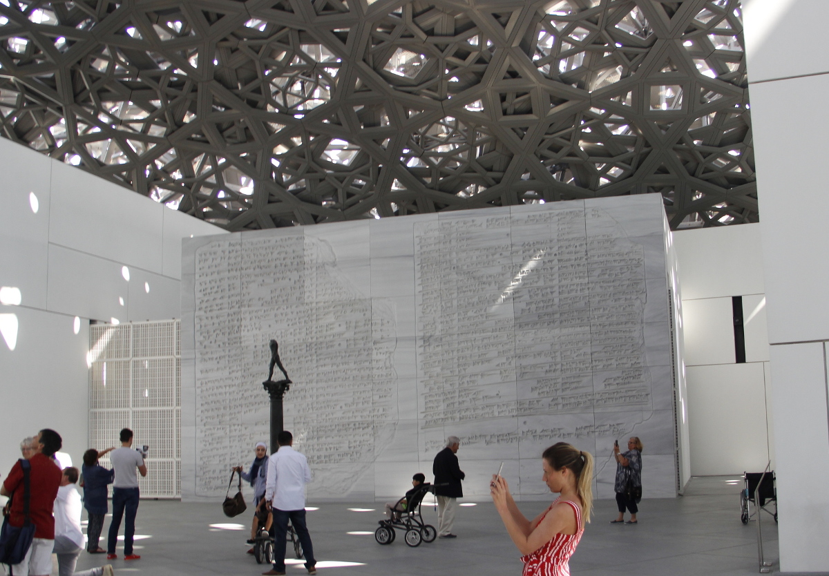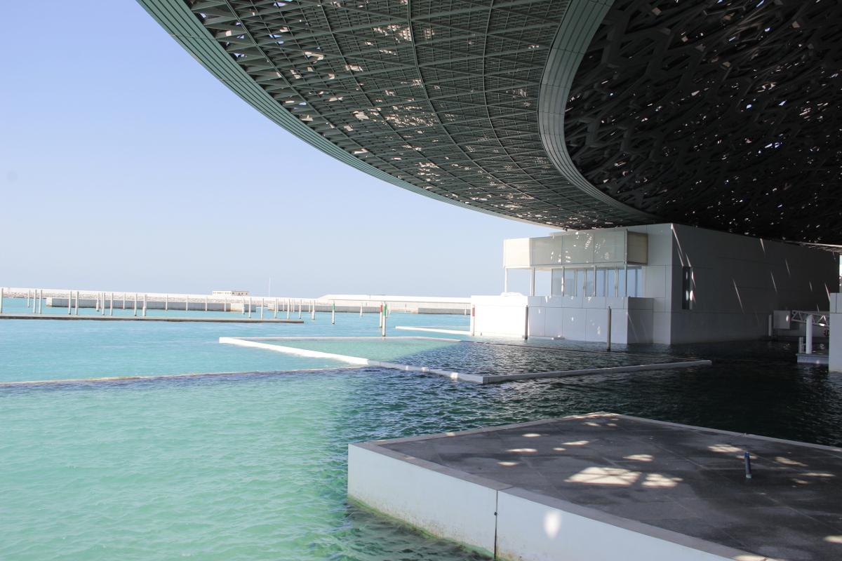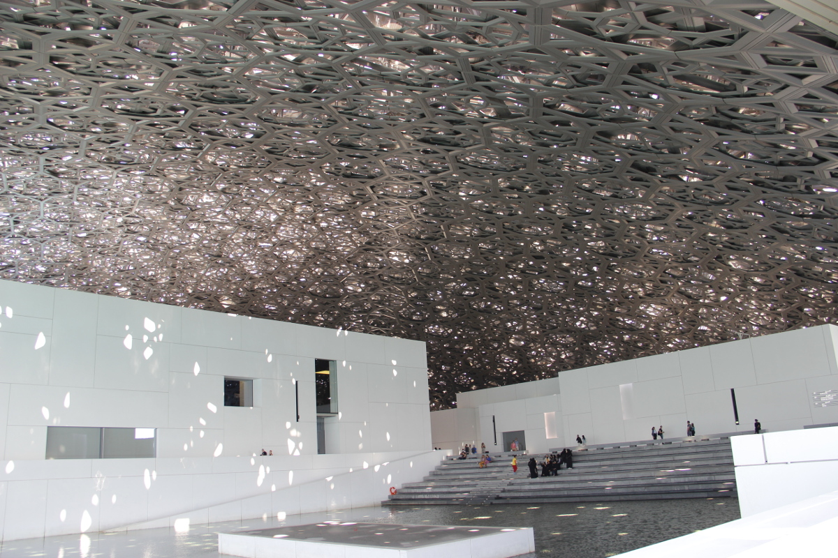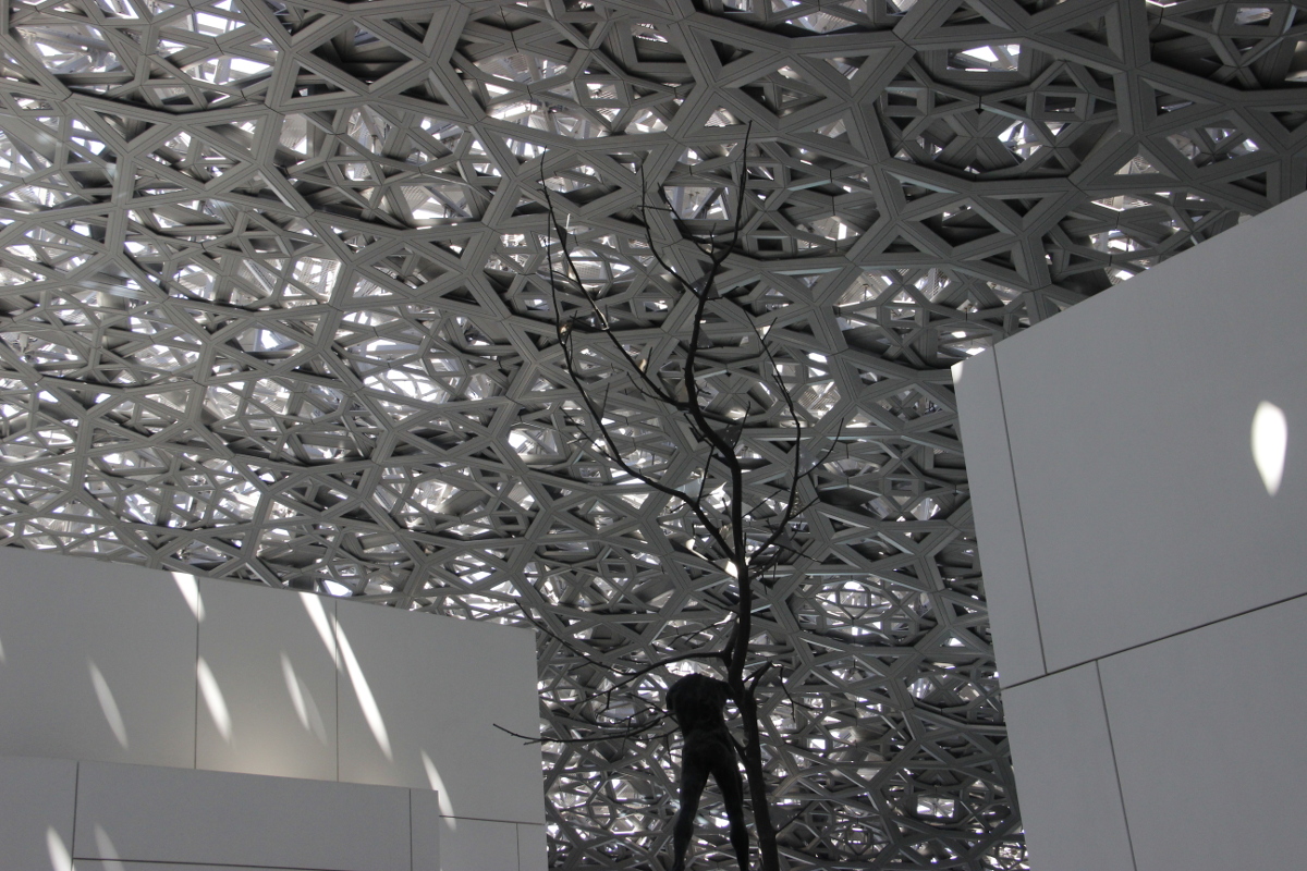 Wir überqueren mit dem Taxi eine Brücke auf dem Weg zu einer der vielen künstlichen Inseln. Auf Saadiyat Island entsteht ein neues Kulturviertel. Neben dem Louvre wird hier das Guggenheim Abu Dhabi und ein Nationalmuseum entstehen. Was wir bei unserer Ankunft sehen, ist sicherlich nach Angkor ein Highlight dieser Reise. Das Museum ist architektonisch schlicht überwältigend. Konzipiert ist die Sammlung des Louvre auf die Zeit von der Antike bis zum 21. Jahrhundert. Die Ausstellungen sind sorgfältig kuratiert (die Scheichs sind wahrscheinlich mit einer sehr großen Brieftasche einkaufen gegangen) und mit modernster Technik präsentiert.